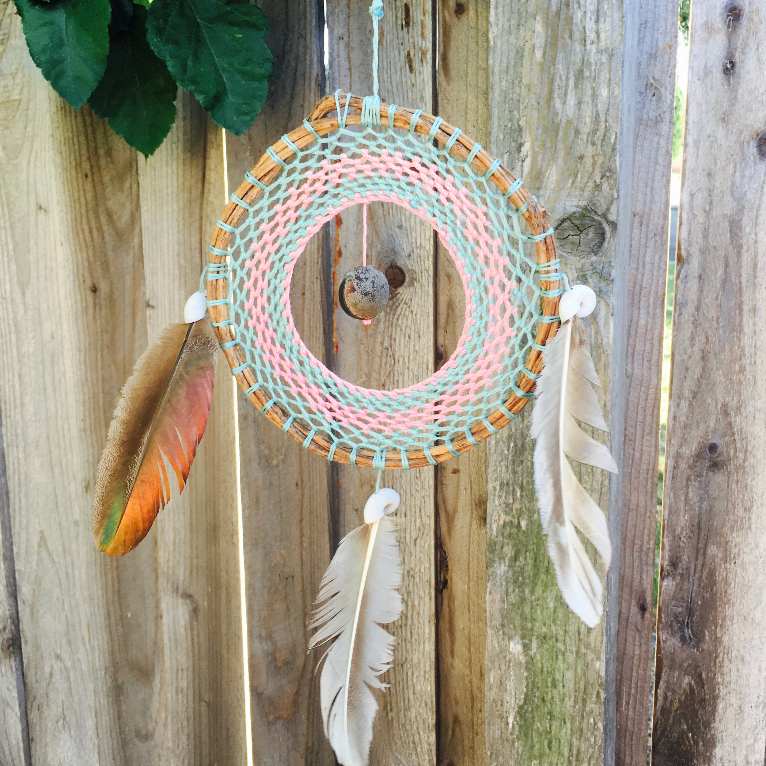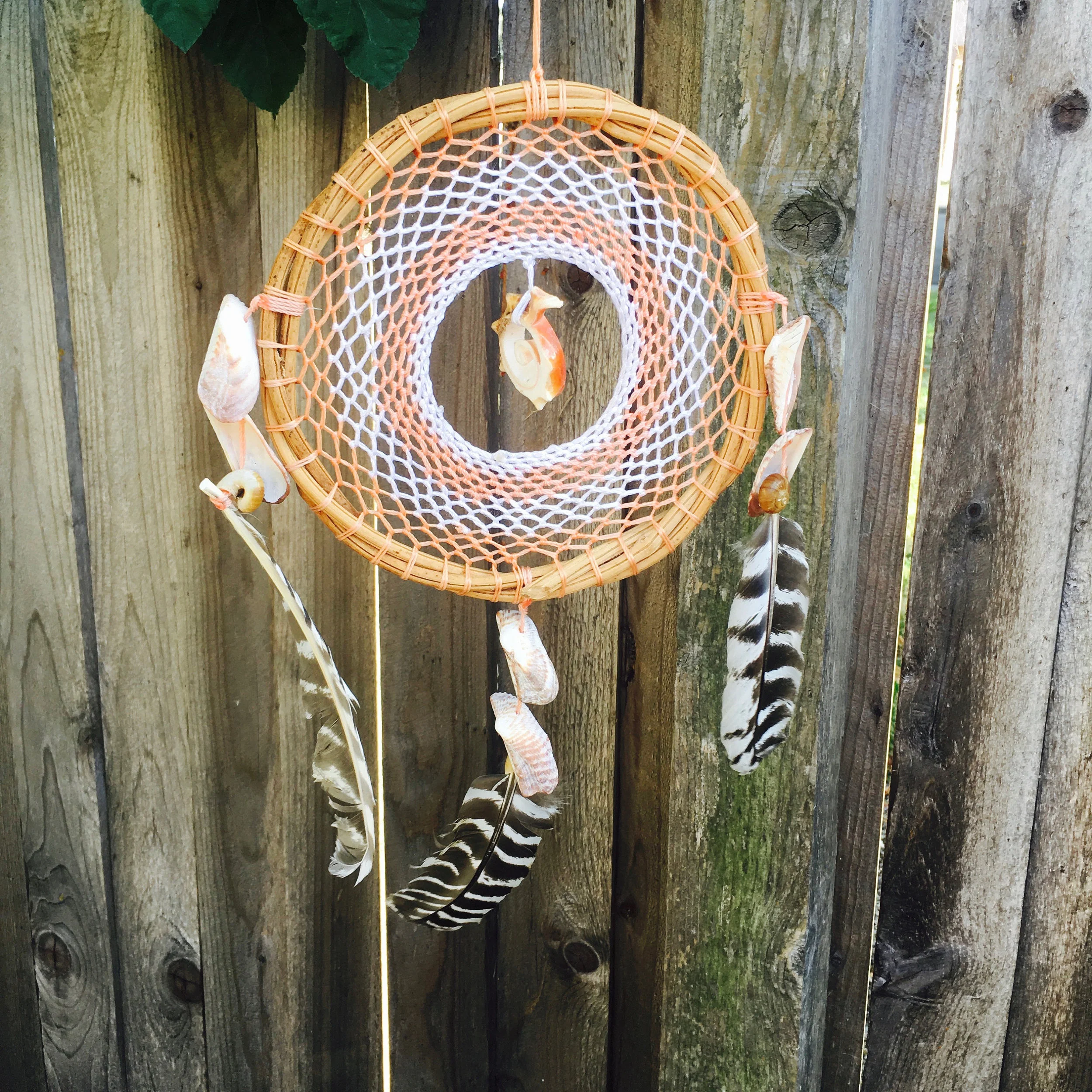 Handmade Crochet Mayan Dream Catcher Coral + White with Spiral Shell and Feathers ||| Mexican Folk Art ||| Home Decor