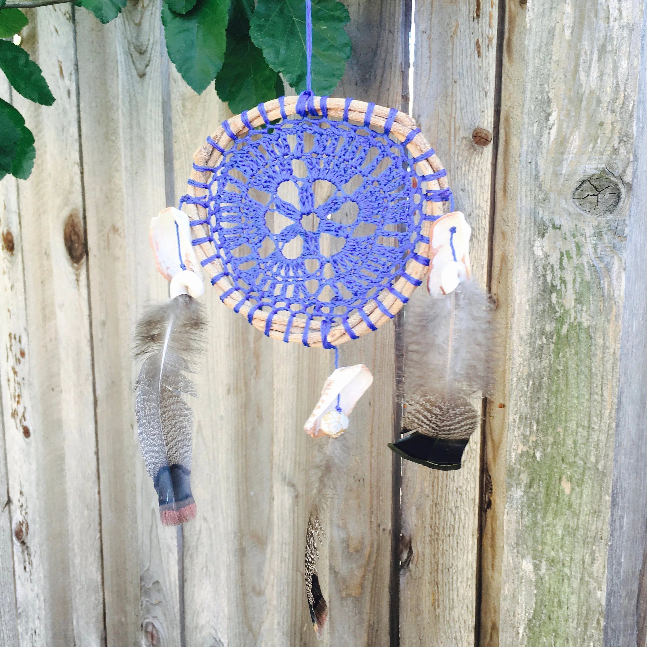 Handmade Crochet Mayan Dream Catcher Royal Blue with Shells and Metallic Tip Feathers ||| Mexican Folk Art ||| Home Decor