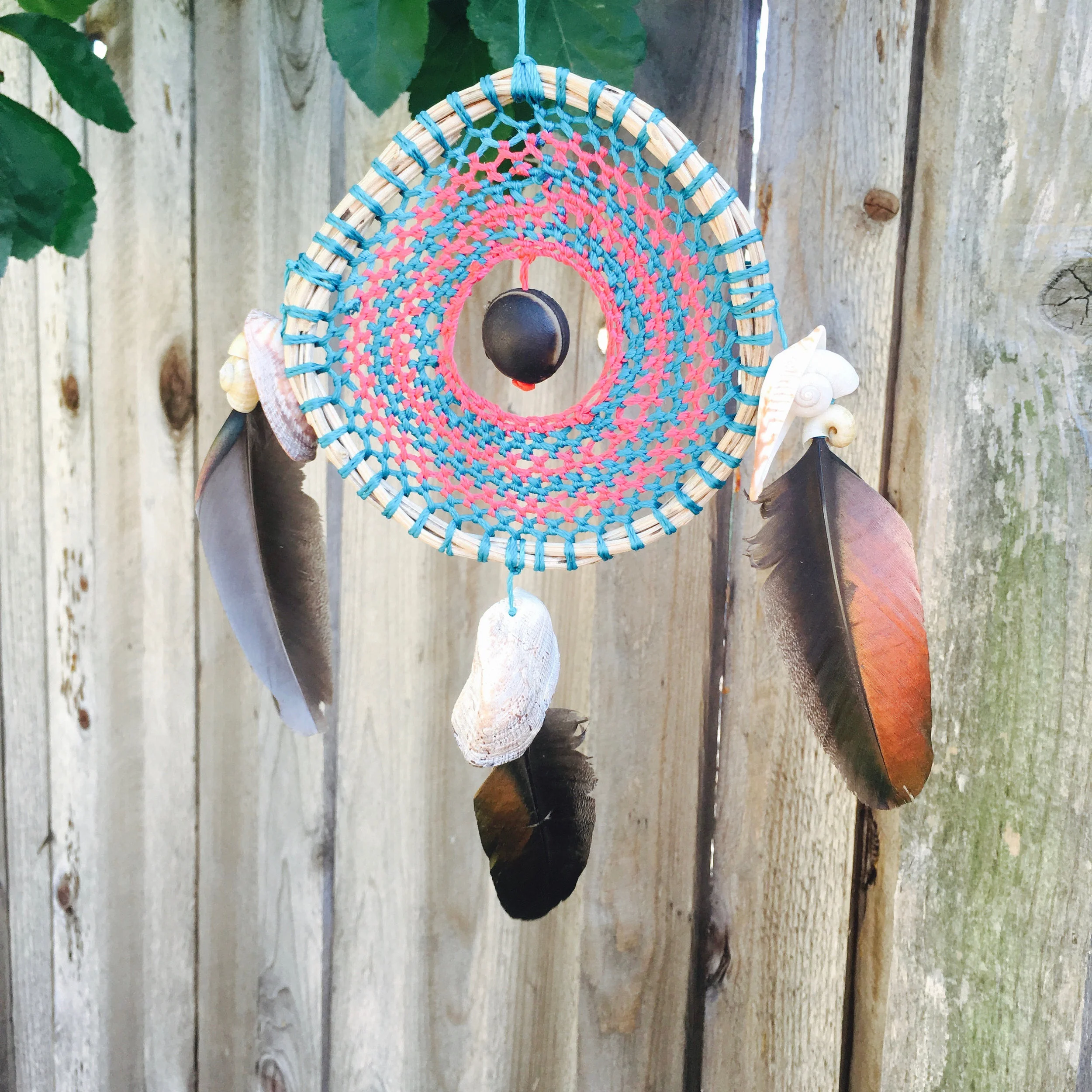 Handmade Crochet Mayan Dream Catcher Turquoise + Hot Pink with Metallic Feathers + Ojo de Venado ||| Mexican Folk Art ||| Home Decor