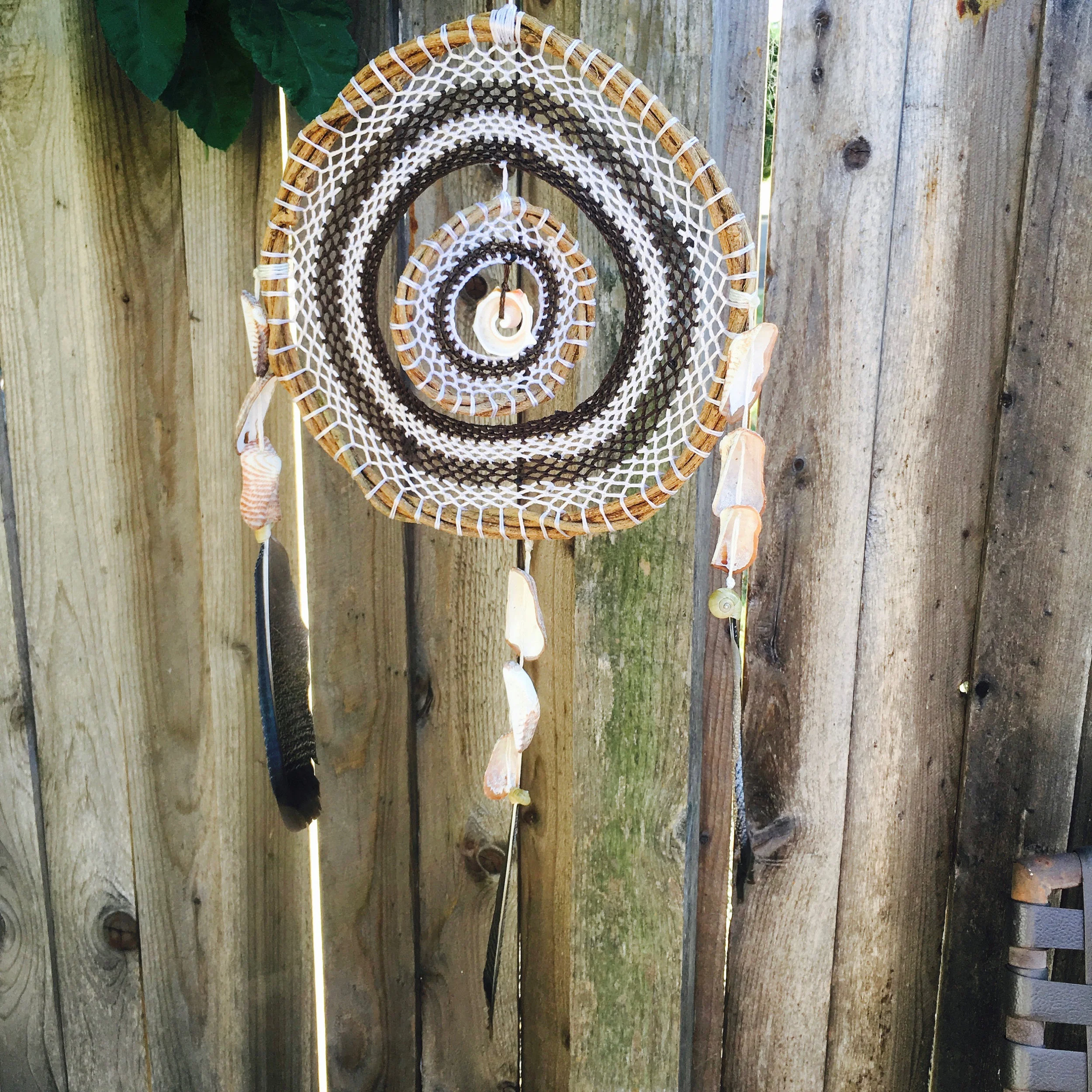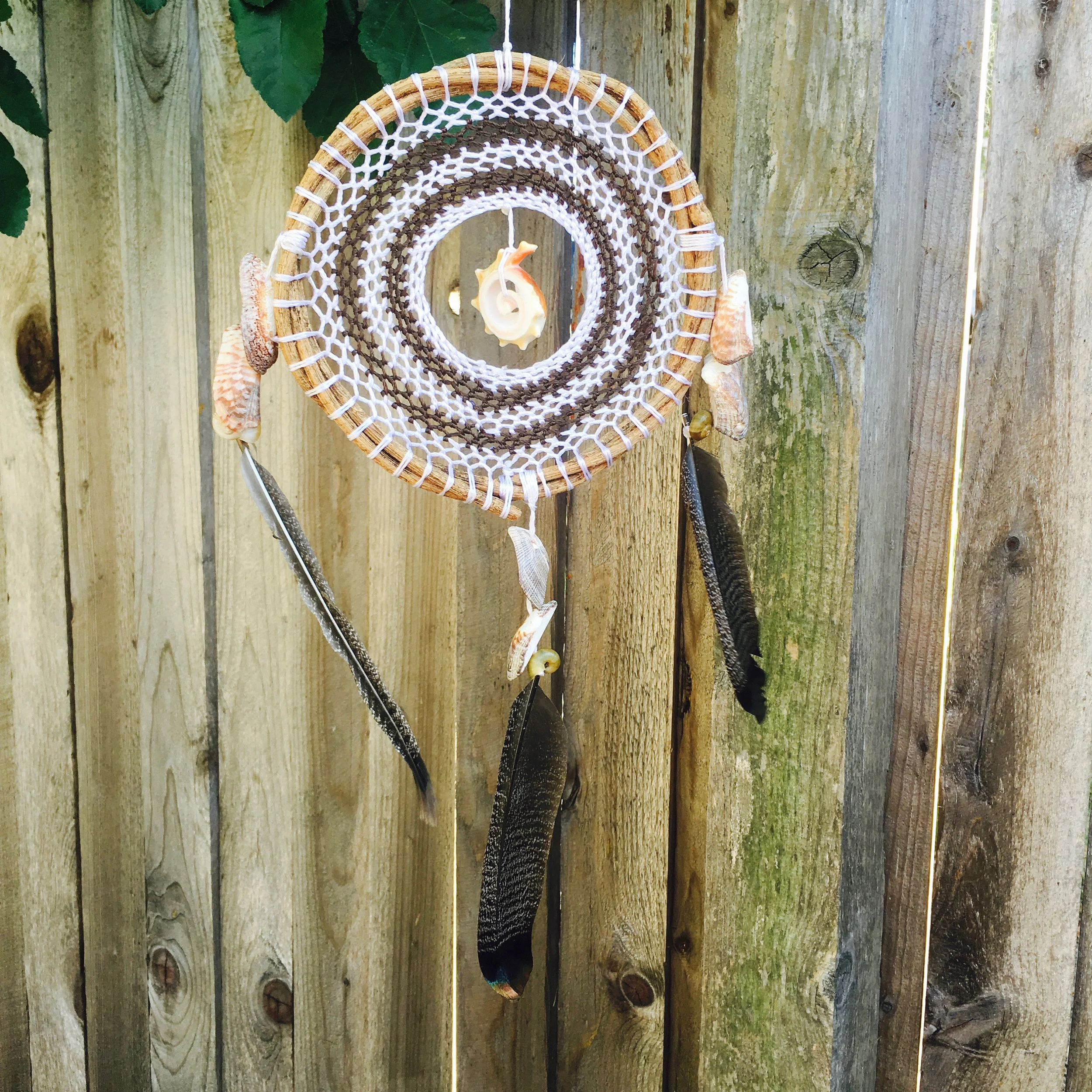 Handmade Crochet Mayan Dream Catcher Brown + White with Spiral Shell and Metallic Tip Feathers ||| Mexican Folk Art ||| Home Decor