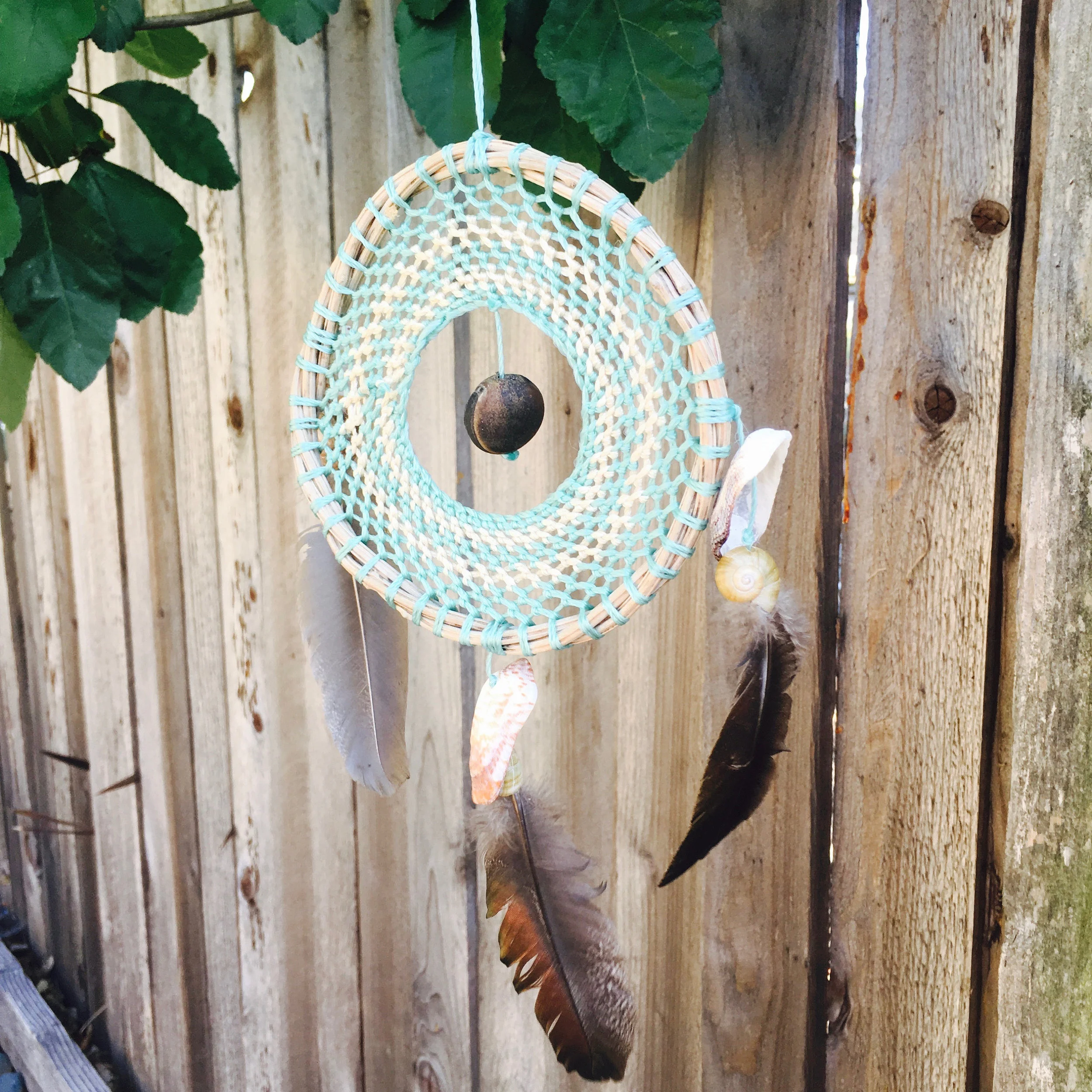 Handmade Crochet Mayan Dream Catcher Teal + Cream with Metallic Feathers + Ojo de Venado ||| Mexican Folk Art ||| Home Decor