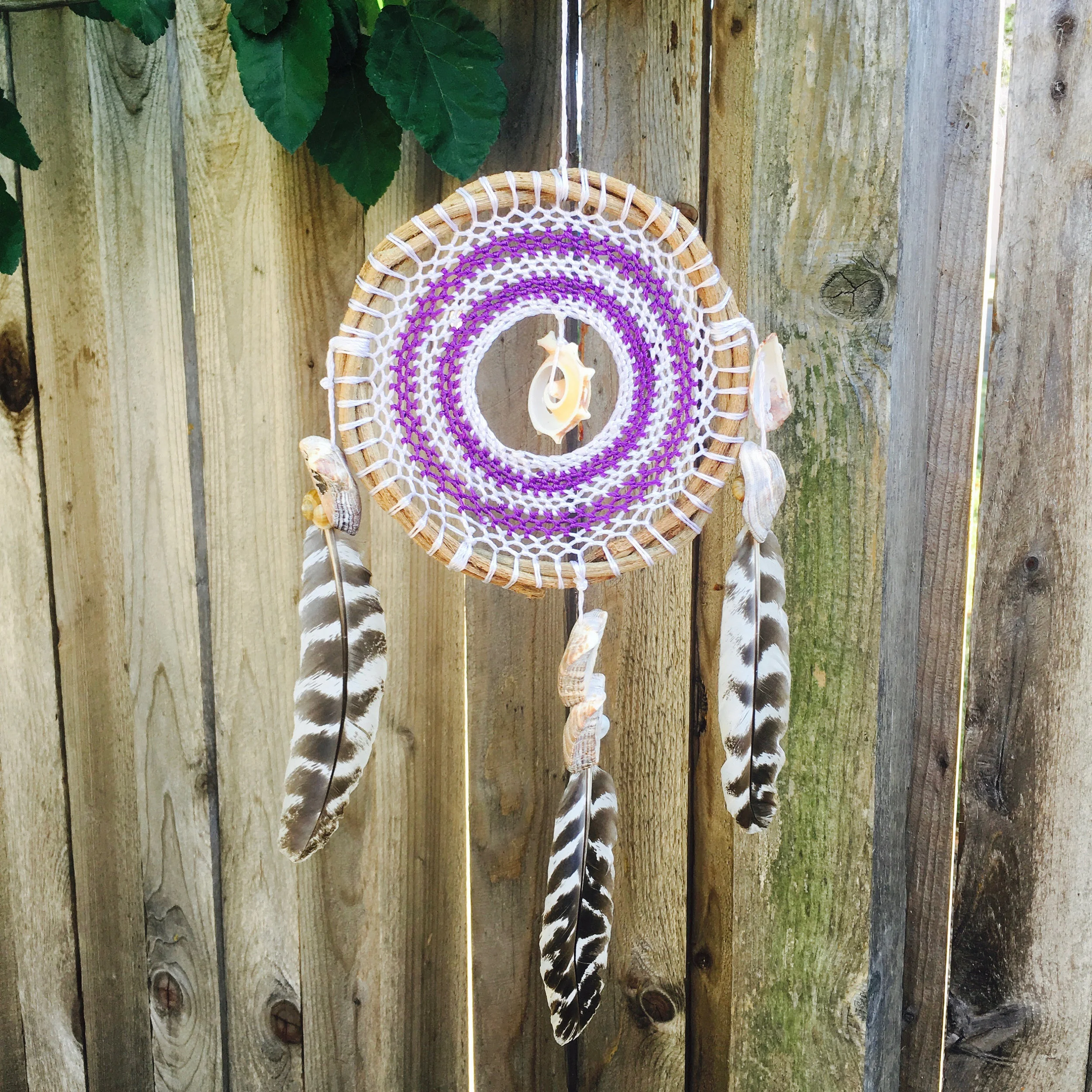 Handmade Crochet Mayan Dream Catcher Purple + White with Spiral Shell and Feathers ||| Mexican Folk Art ||| Home Decor