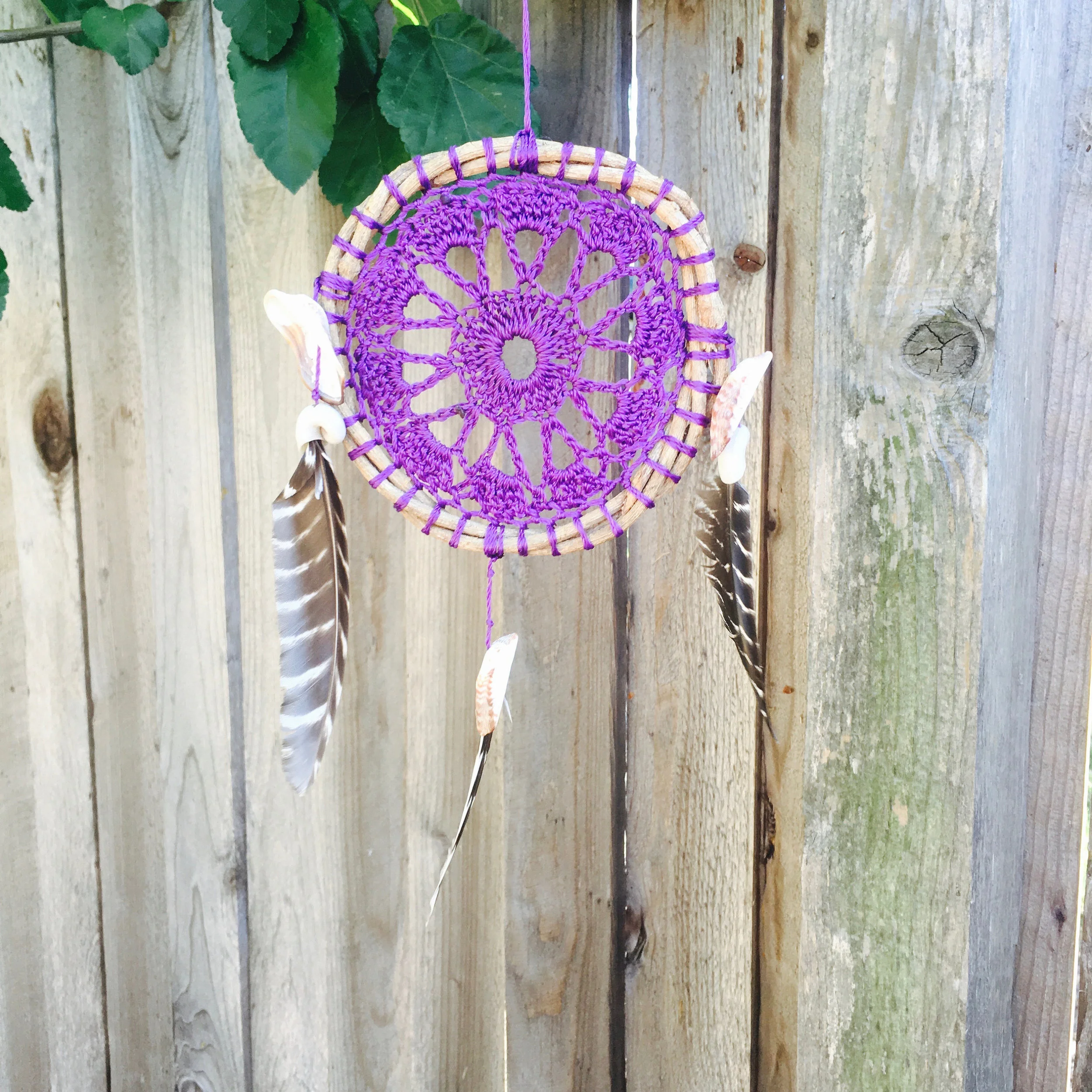 Handmade Crochet Mayan Dream Catcher Vibrant Purple with Shells and Feathers ||| Mexican Folk Art ||| Home Decor