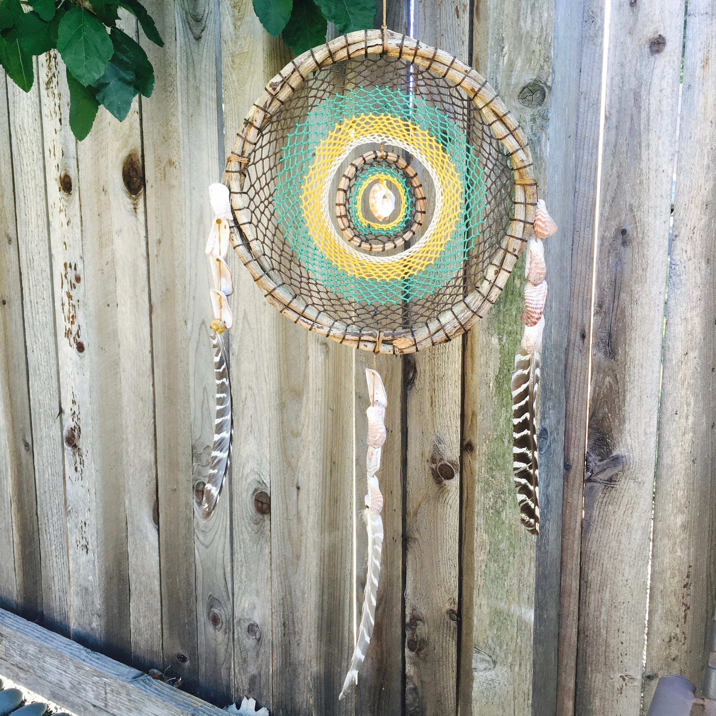 Handmade Crochet Mayan Dream Catcher with Shells and Feathers ||| Mexican Folk Art ||| Home Decor