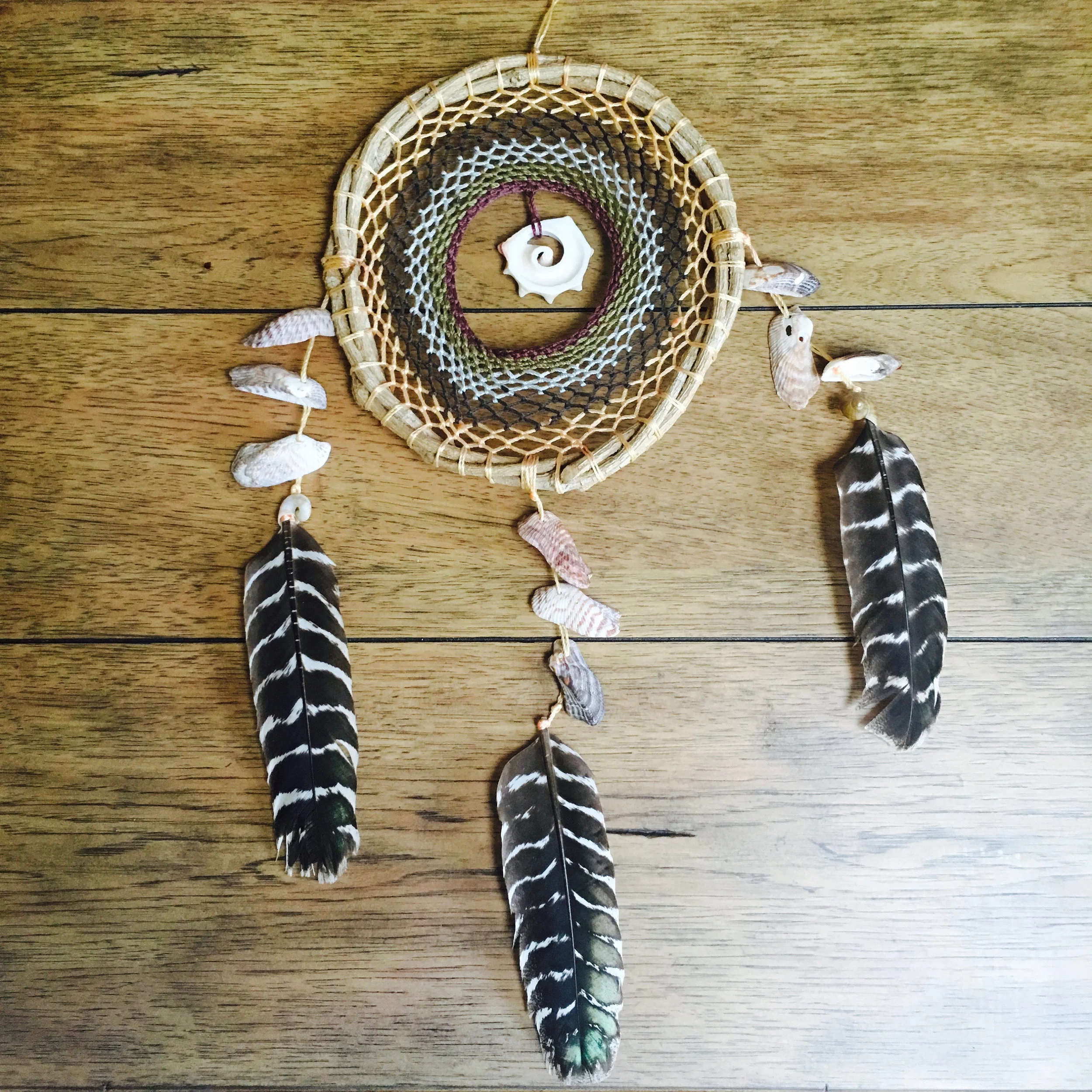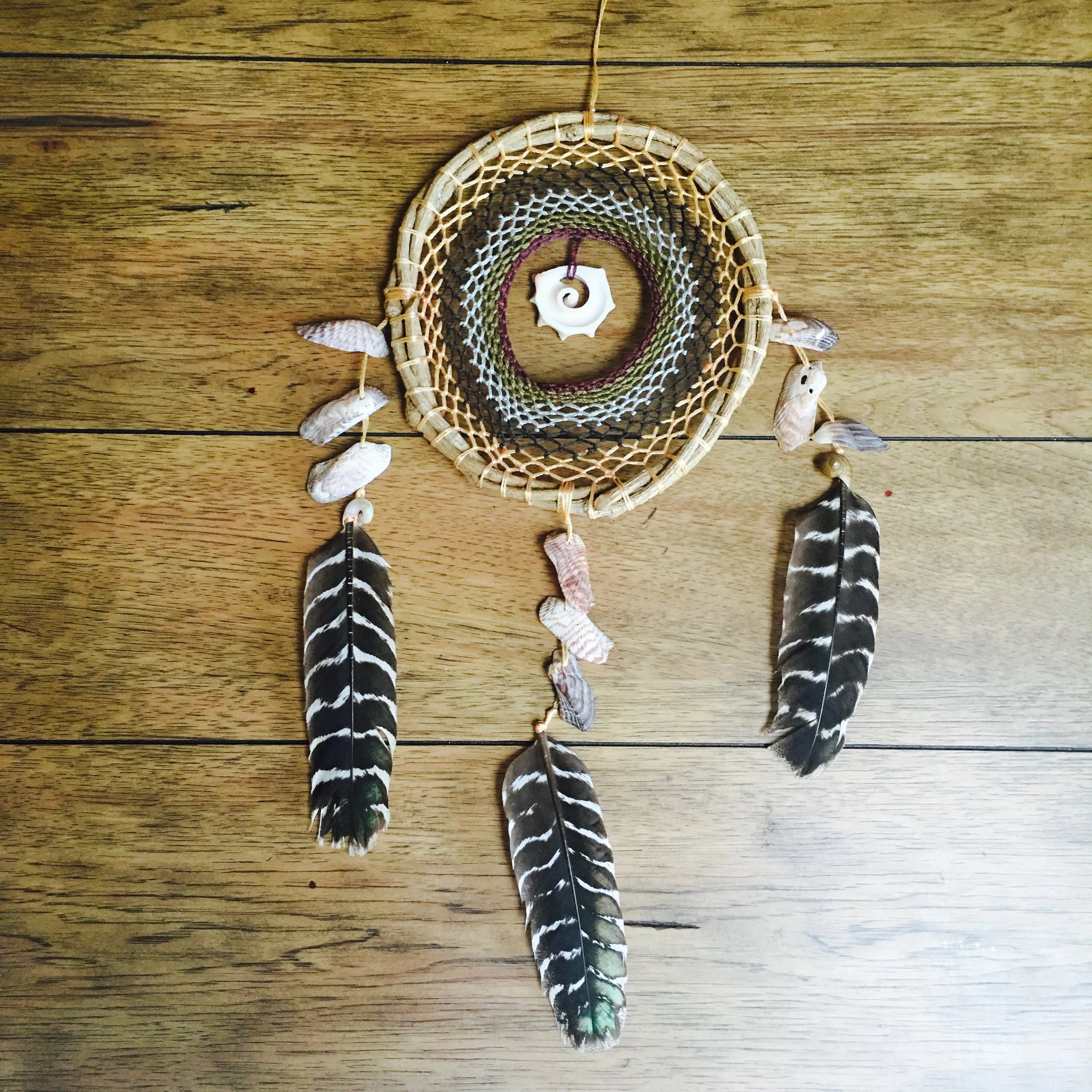 Accent your home decór with this one-of-a-kind handcrafted Mayan dreamcatcher from a small village on the outskirts of Tulum, Mexico. This earth-tone medley fishnet style weave is a unique take on the traditional Native American dream catchers with the lovely intricate spiral shell centerpiece and gently suspended shells and striped accent feathers.