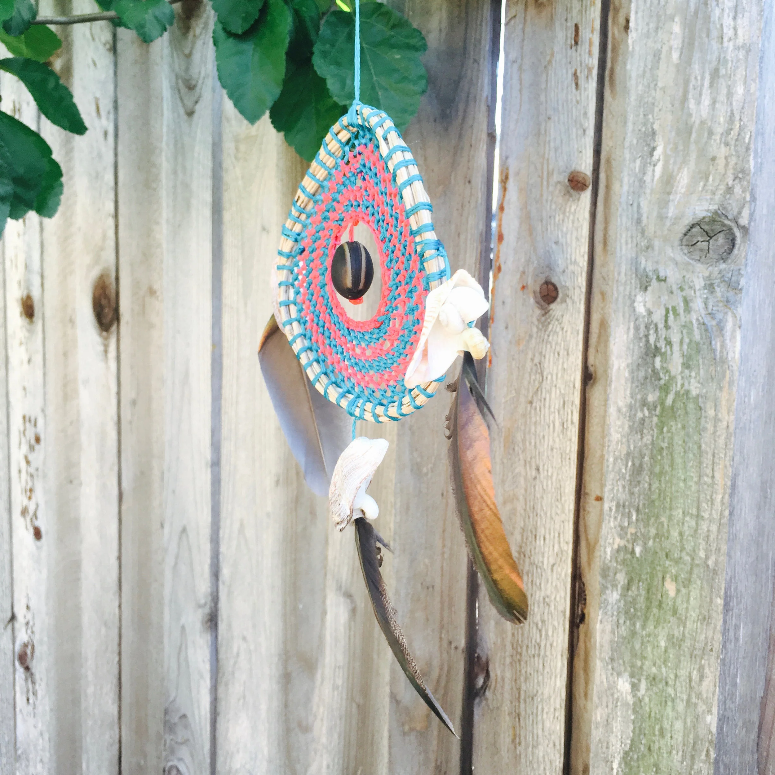 Handmade Crochet Mayan Dream Catcher Turquoise + Hot Pink with Metallic Feathers + Ojo de Venado ||| Mexican Folk Art ||| Home Decor